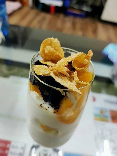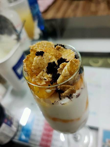 優格與芒果和玉米片一層一層有秩序的堆疊上去
